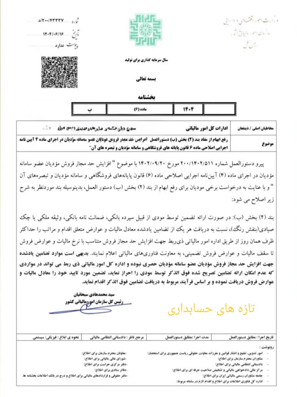 افزایش حد مجاز فروش مؤدیان عضو سامانه مؤدیان