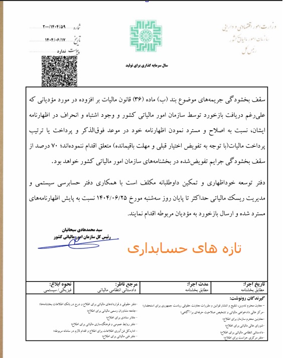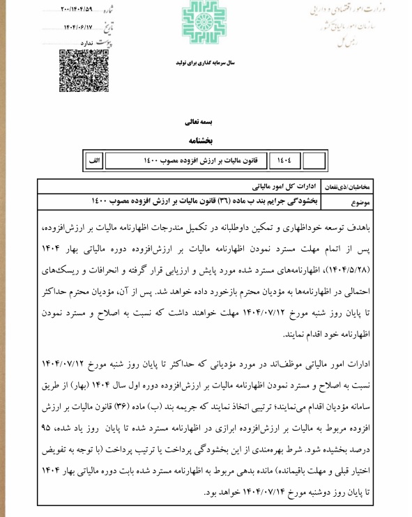 بر این اساس، مؤدیانی که حداکثر تا پایان روز شنبه ۱۲ مهرماه ۱۴۰۴ نسبت به اصلاح و مسترد نمودن اظهارنامه مالیات بر ارزش‌افزوده دوره اول (بهار) سال ۱۴۰۴ از طریق سامانه مؤدیان اقدام می‌نمایند؛ جریمه‌ بند (ب) ماده (۳۶)‌ قانون مالیات بر ارزش افزوده مربوط به مالیات بر ارزش‌افزوده ابرازی در اظهارنامه مسترد شده تا پایان روز یادشده، ۹۵ درصد بخشیده خواهد شد.