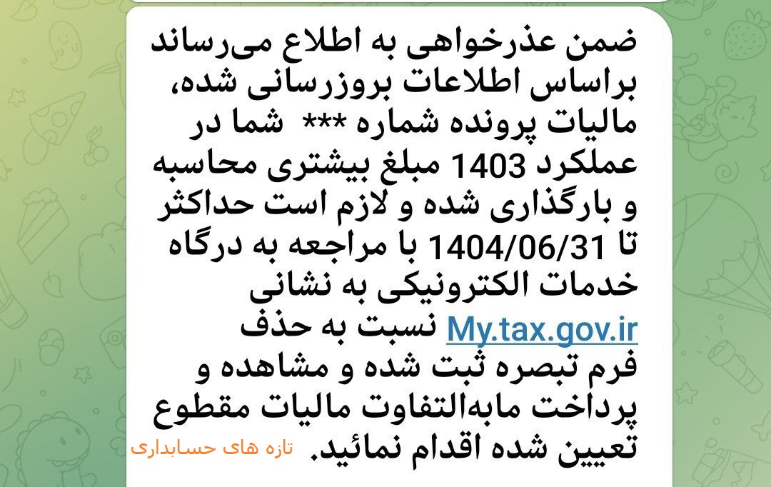«براساس اطلاعات بروز رسانی شده، مالیات پرونده … شما در عملکرد ۱۴۰۳ مبلغ بیشتری محاسبه و بارگذاری شده و لازم است حداکثر تا تاریخ ۱۴۰۳.۰۶.۳۱ با مراجعه با درگاه خدمات الکترونیکی … نسبت به حذف فرم تبصره ثبت شده و مشاهده و پرداخت مابه التفاوت مالیات مقطوع تعیین شده اقدام نمایید».