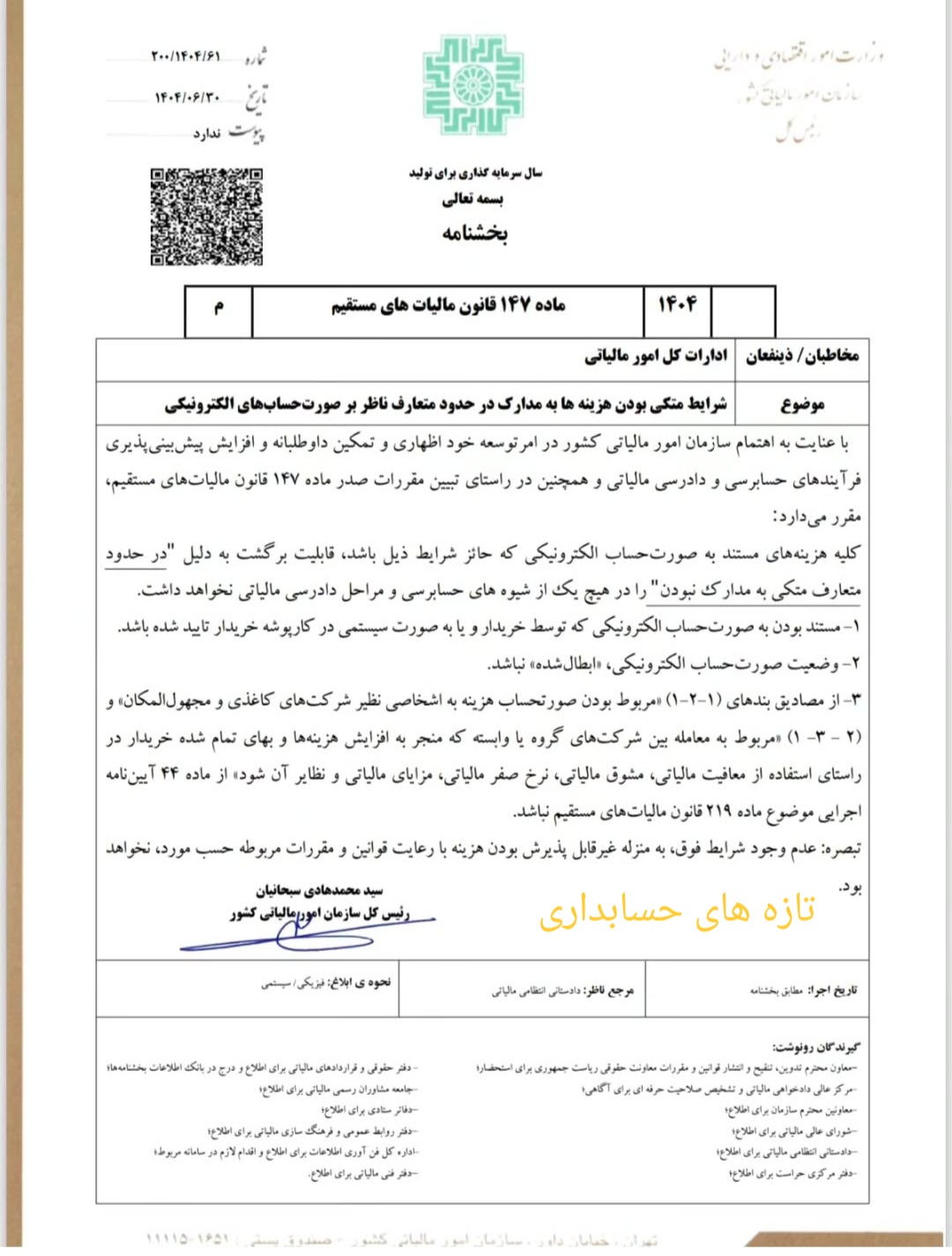 شرایط متکی بودن هزینه ها به اسناد و مدارک در حدود متعارف ناظر بر صورتحسابهای الکترونیکی شرایط متکی بودن هزینه ها به اسناد و مدارک در حدود متعارف ناظر بر صورتحسابهای الکترونیکی موضوع ماده ١۴٧ ق.م.م اعلام شد.
