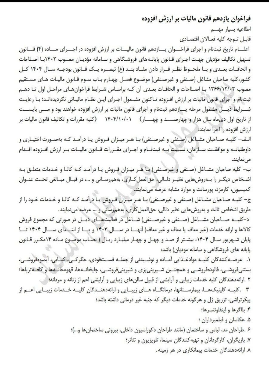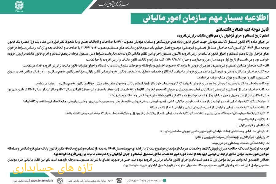 در اجرای ماده (۴) قانون تسهیل تکالیف مؤدیان جهت اجرای قانون پایانههای فروشگاهی و سامانه مؤدیان مصوب ۱۴۰۲با اصلاحات و الحاقات بعدی و با ملحوظ نظر قرار دادن مفاد بند (غ) تبصره یک قانون بودجه سال ۱۴۰۴ کل کشور،کلیه صاحبان مشاغل (صنفی و غیرصنفی) موضوع فصل چهارم باب سوم قانون مالیات های مستقیم مصوب ۰۳/۱۲/۱۳۶۶ با اصلاحات و الحاقات بعدی آن كه براساس شرایط فراخوانهای مراحل اول تا دهم ثبتنام و اجراي قانون مالیات بر ارزش افزوده تاکنون مشمول اجراي این نظام مالیاتی نگردیدهاند؛ با رعایت شرایط ذیل ﻣﺸﻤﻮل ﻣﺮﺣﻠﻪ یازدهم ﺛﺒﺖﻧﺎم و تکالیف ﻗﺎﻧﻮن مالیات ﺑﺮ ارزش اﻓﺰوده ﺧﻮاﻫﻨﺪ ﺑﻮد و می بایست از ﺗﺎرﻳﺦ اول دیﻣﺎه ﺳﺎل ﻫﺰار و چهارصد و چهار (۰۱/۱۰/۱۴۰۴) کلیه ﻣﻘﺮرات و ﺗﻜﺎﻟﻴﻒ ﻗﺎﻧﻮن مالیات ﺑﺮ ارزش اﻓﺰوده را اجرا نمایند: