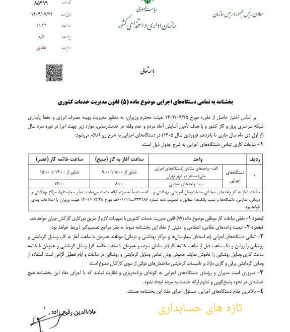 بخشنامه تعیین ساعت کار تمامی دستگاههای اجرایی از اول دی ۱۴۰۴ ضمنا «تغیبر ساعات کاری دستگاههای اجرایی در دوره سرد سال» نیز اعلام شد.